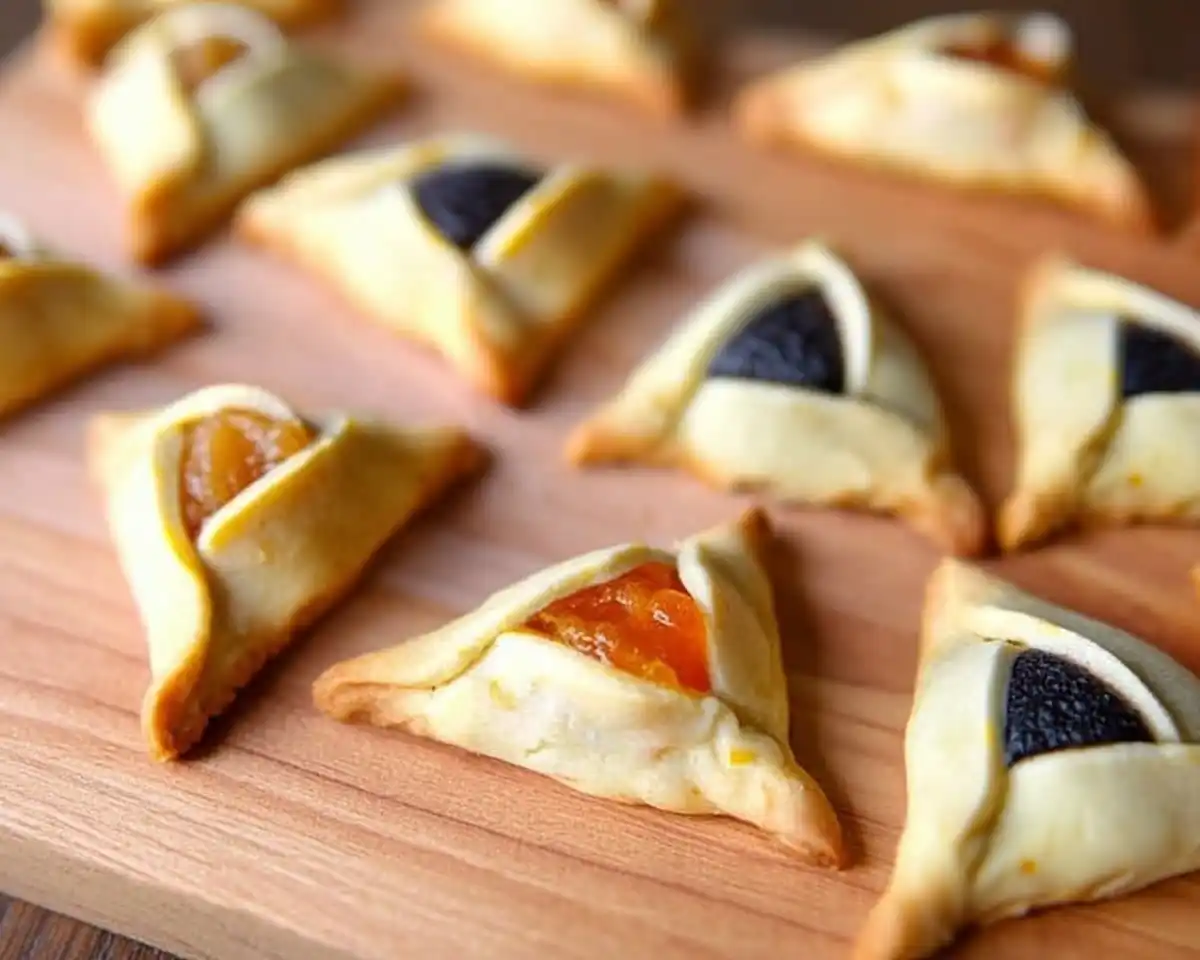A classic mohn (poppy seed) filling is made with ground poppy seeds, honey or sugar, lemon zest, and sometimes raisins or vanilla. It has a dense, slightly earthy-sweet flavor and a dark color that contrasts beautifully with the golden buttery dough. It’s the most traditional Purim filling and a perfect pairing with this recipe.