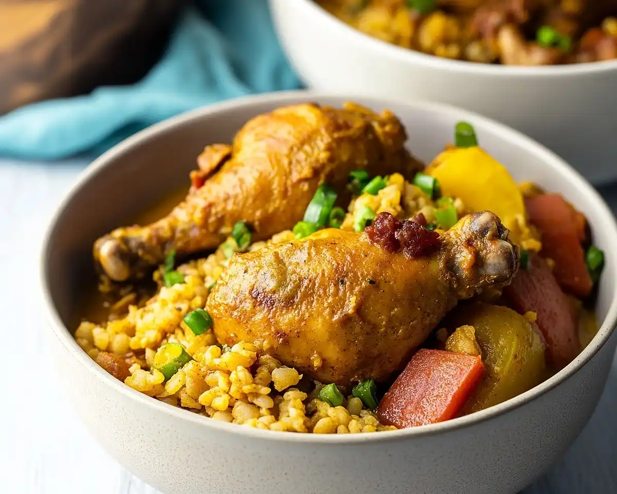 Discover the bold, warming flavors of a homemade caribbean curry bowl packed with tender bone-in chicken, chunky vegetables, and a rich, spiced broth that tastes like it simmered all day.