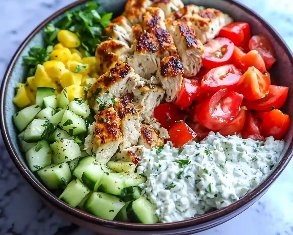 - Start with a base of rice or quinoa in each bowl, then add shredded romaine lettuce. Arrange tomatoes, cucumbers, and red onion around the bowl. Slice chicken against the grain and lay on top. Crumble feta cheese over everything and drizzle with tzatziki sauce. Garnish with extra dill or lemon if desired.