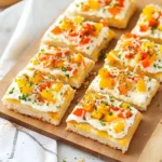 The beauty of this recipe is how flexible it is. Cherry tomatoes, cucumber slices, black olives, cauliflower florets, and sweet corn are all fantastic options. Just make sure everything is chopped small and patted dry so the crust stays crisp and the spread doesn’t get watery.