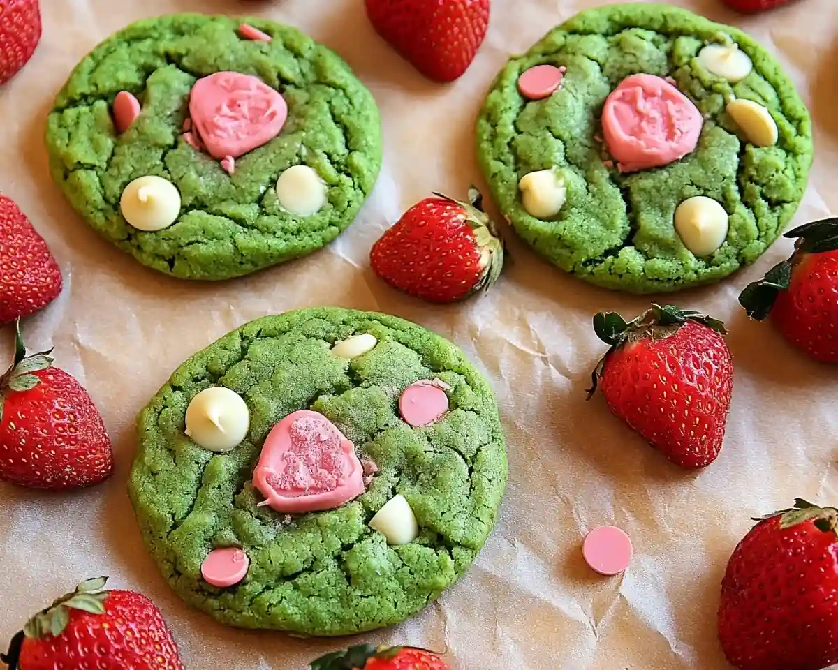 Double strawberry chocolate matcha cookies with viral green and pink appeal. Easy recipe with freeze-dried strawberries and white chocolate coating.
