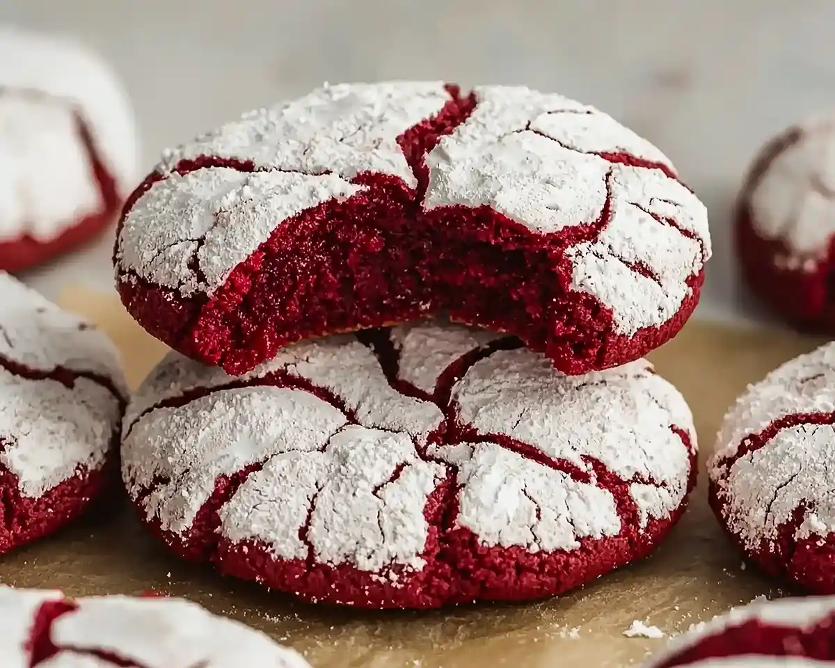 Fudgy Red Velvet Crinkle Cookies recipe with chocolate and festive red color. Perfect homemade red velvet cookies for Christmas baking and holiday treats.