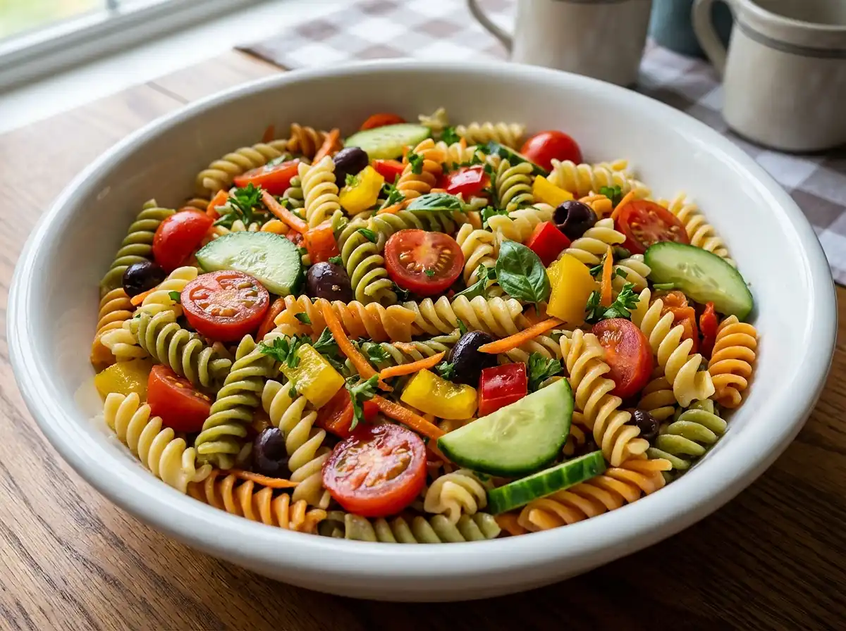 Think crunchy veggies, tender rotini pasta, and a zesty lemon-herb dressing that ties everything together like a warm hug. Honestly, once you make it, you’ll wonder how you survived summer without it.