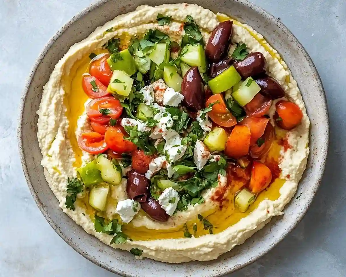 This is a hummus with toppings situation taken fully to the next level. You get creamy, dreamy hummus as the base, topped with a zesty marinated veggie mix loaded with kalamata olives, cherry tomatoes, cucumbers, pepperoncini, and fresh herbs — all finished with a generous drizzle of olive oil and a sprinkle of sumac or paprika. It’s bright, it’s bold, it’s Mediterranean magic on a platter.