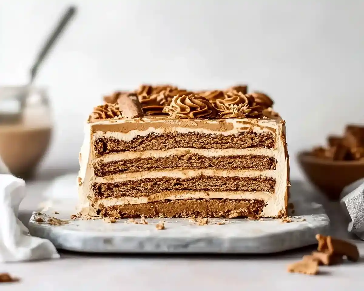 The caramelized sweetness of Biscoff spread transforms ordinary cookies into an elegant layered cake that slices beautifully. Every bite delivers that perfect balance of creamy and tender, with just enough crunch from the cookie butter drizzle on top.