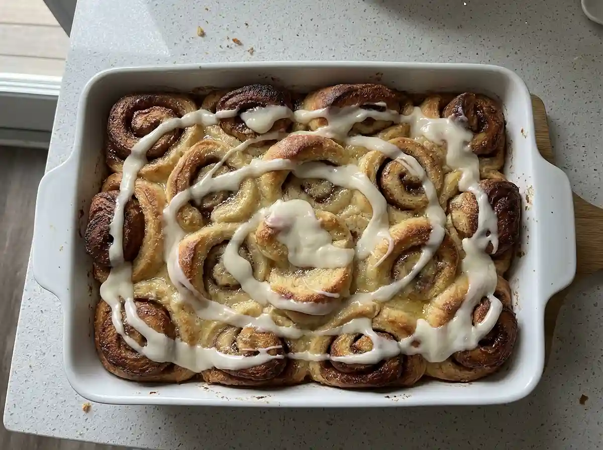 Then drizzle that cream cheese frosting from the cinnamon roll package generously over the top. It’ll melt into all the nooks and crannies — and that’s exactly where you want it. Serve warm and enjoy every gooey bite.