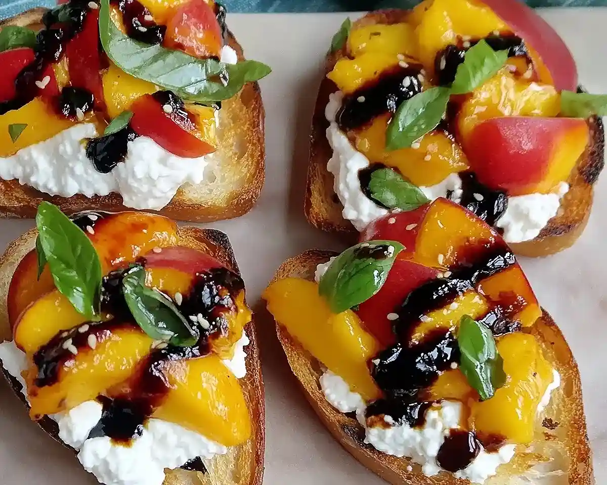 - Spread whipped ricotta on crostini. Stir basil into peach-tomato mixture and spoon on top. Drizzle with balsamic glaze and serve immediately.