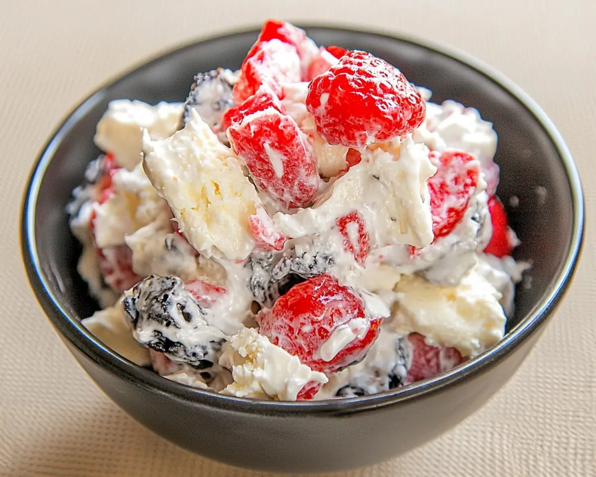 Cheesecake Salad recipe with fresh berries and cream cheese. Perfect red white blue dessert for summer parties in just 5 minutes!