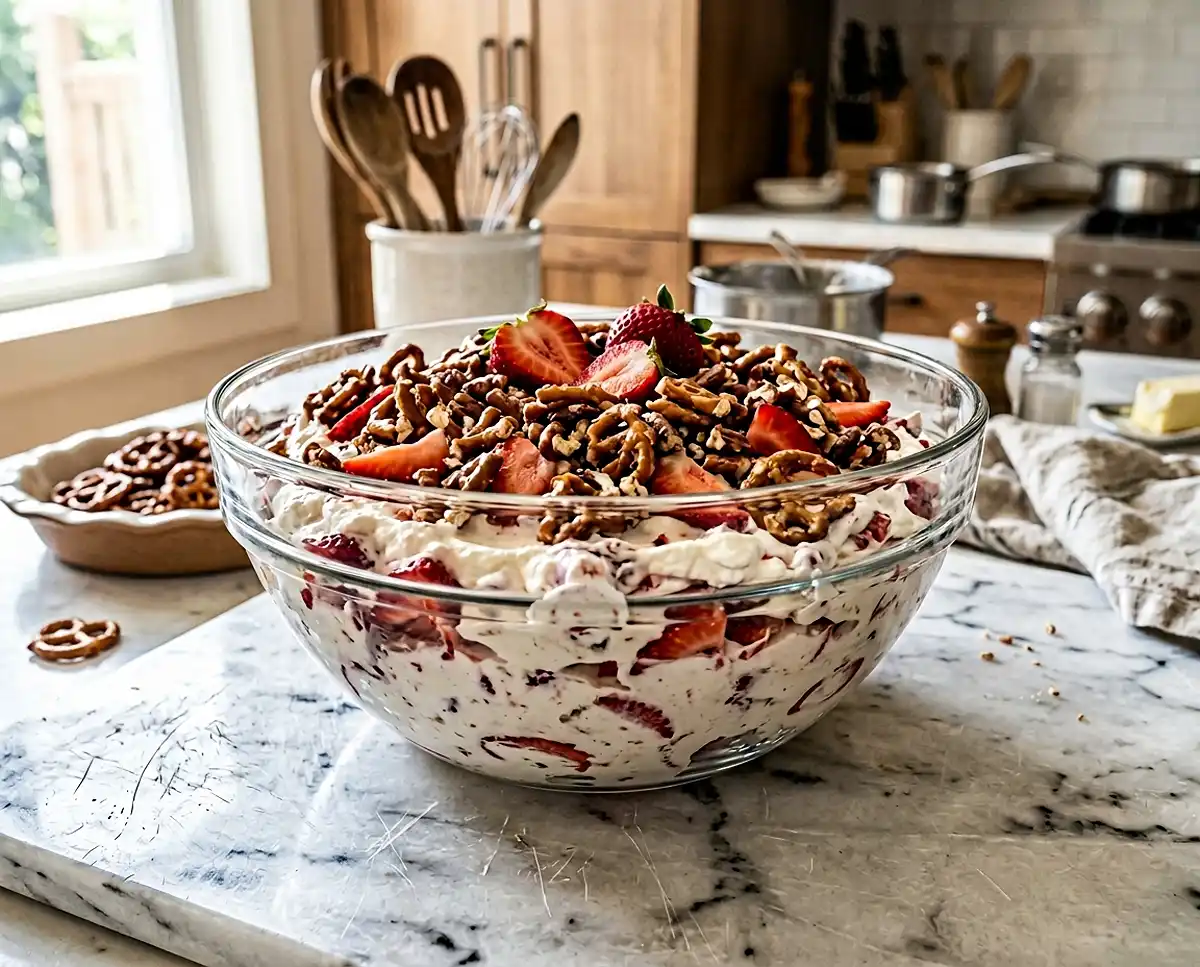 Right before serving, fold the sliced strawberries and half of your pretzel crunch into the cream cheese filling. Scoop it into your serving bowl and top with the remaining crunch for that beautiful, dramatic finish. Serve immediately — this is not a sit-and-wait situation, because the crunch starts to soften the longer it sits in the filling.