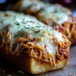 This stuffed garlic bread situation is everything. You’ve got a crusty Italian loaf hollowed out, slathered in garlic butter, toasted until golden, then packed to the brim with saucy spaghetti and blanketed in melted Italian cheese. It’s messy, it’s indulgent, and it’s absolutely the kind of meal that makes everyone at the table go quiet for a minute.